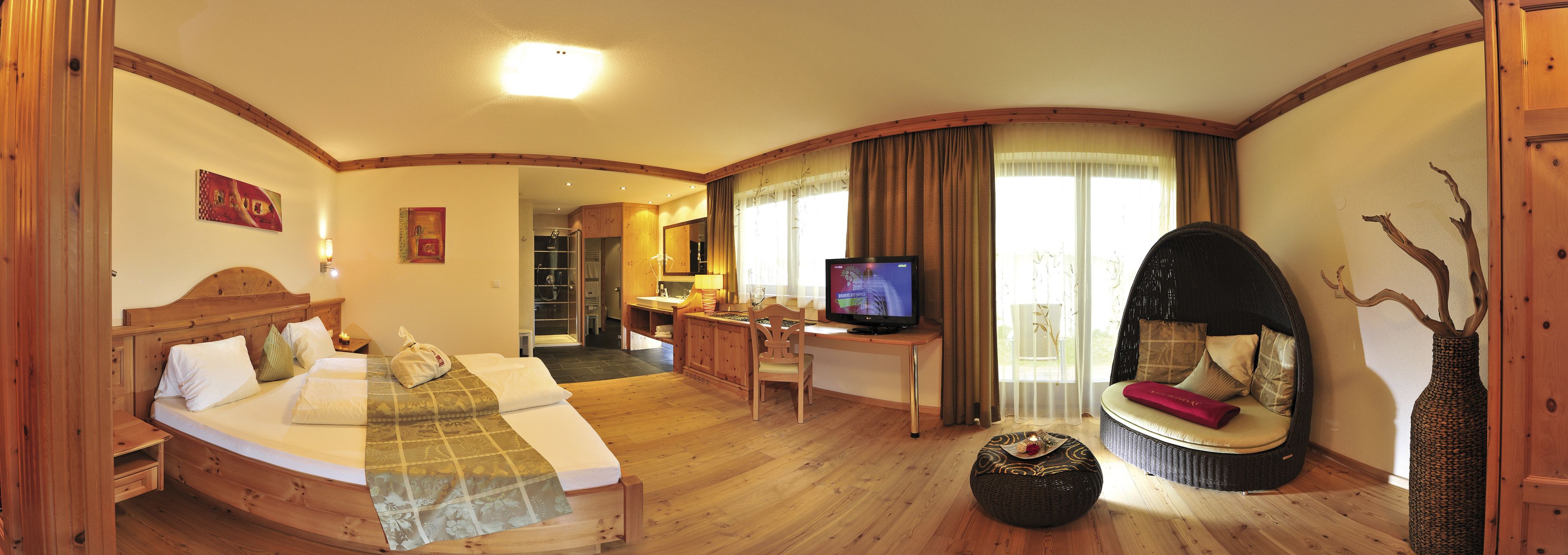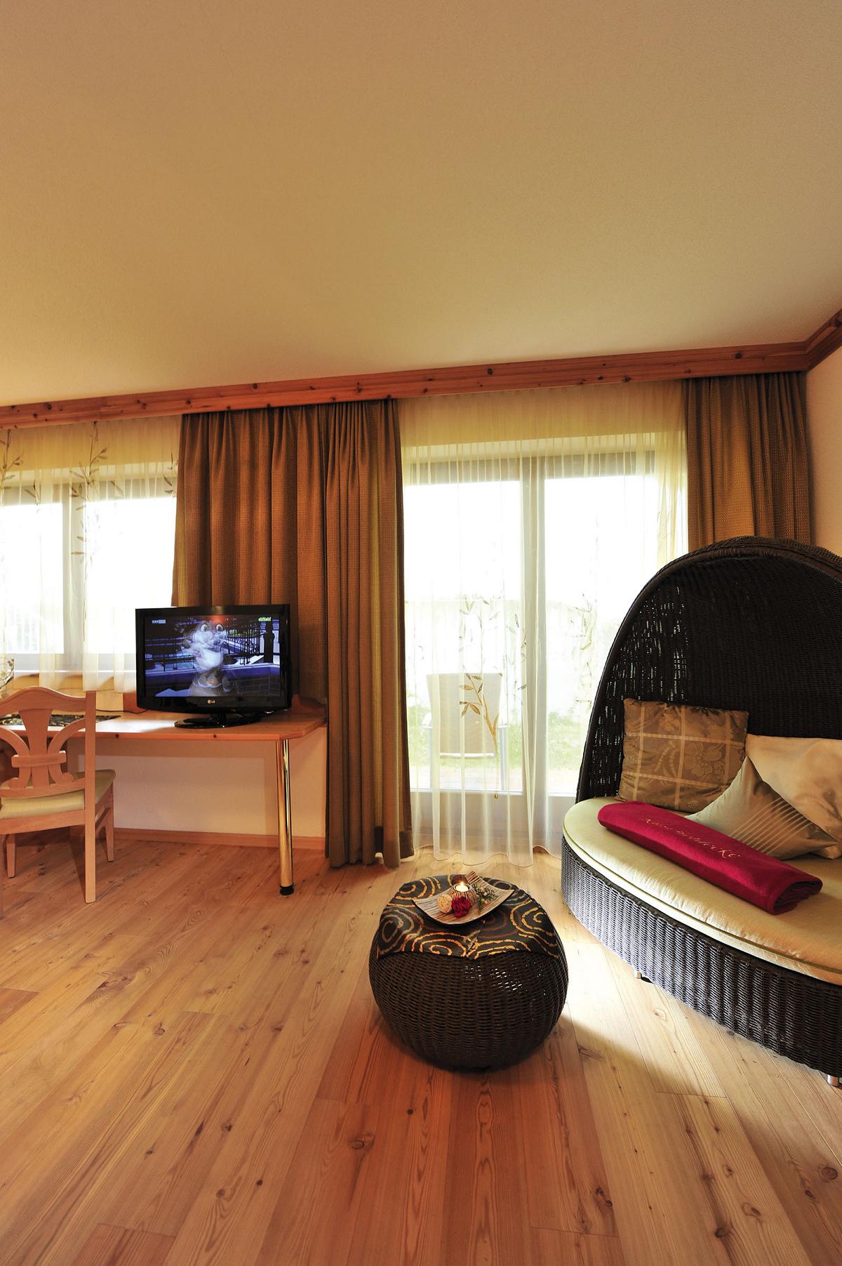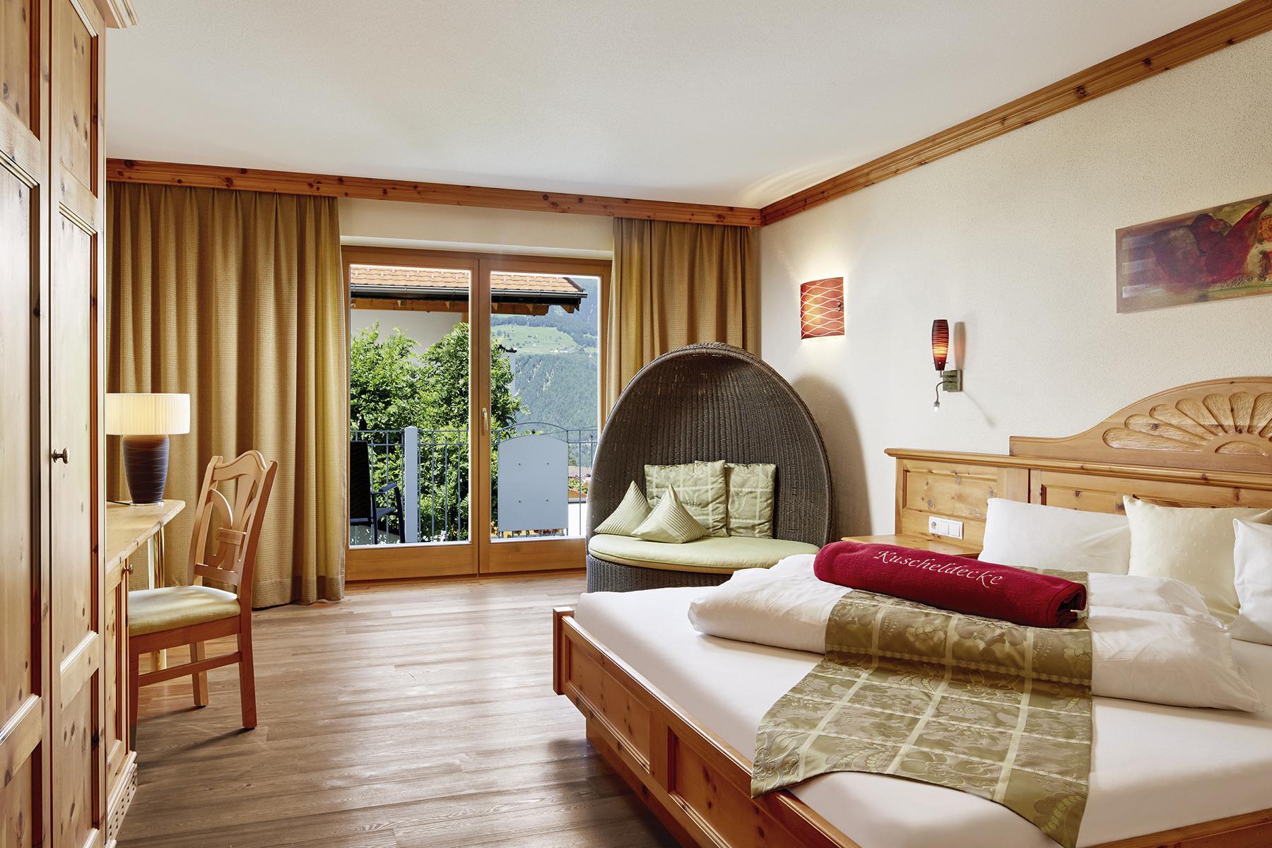 Zirbenholzmöbel und Naturholzboden, Doppelbett, Flat-TV, Safe, Minibar, Telefon, offenes Badezimmer mit Dusche und Doppelwaschtisch, separates WC, Balkon oder Terrasse, teilweise mit Infrarotkabine.